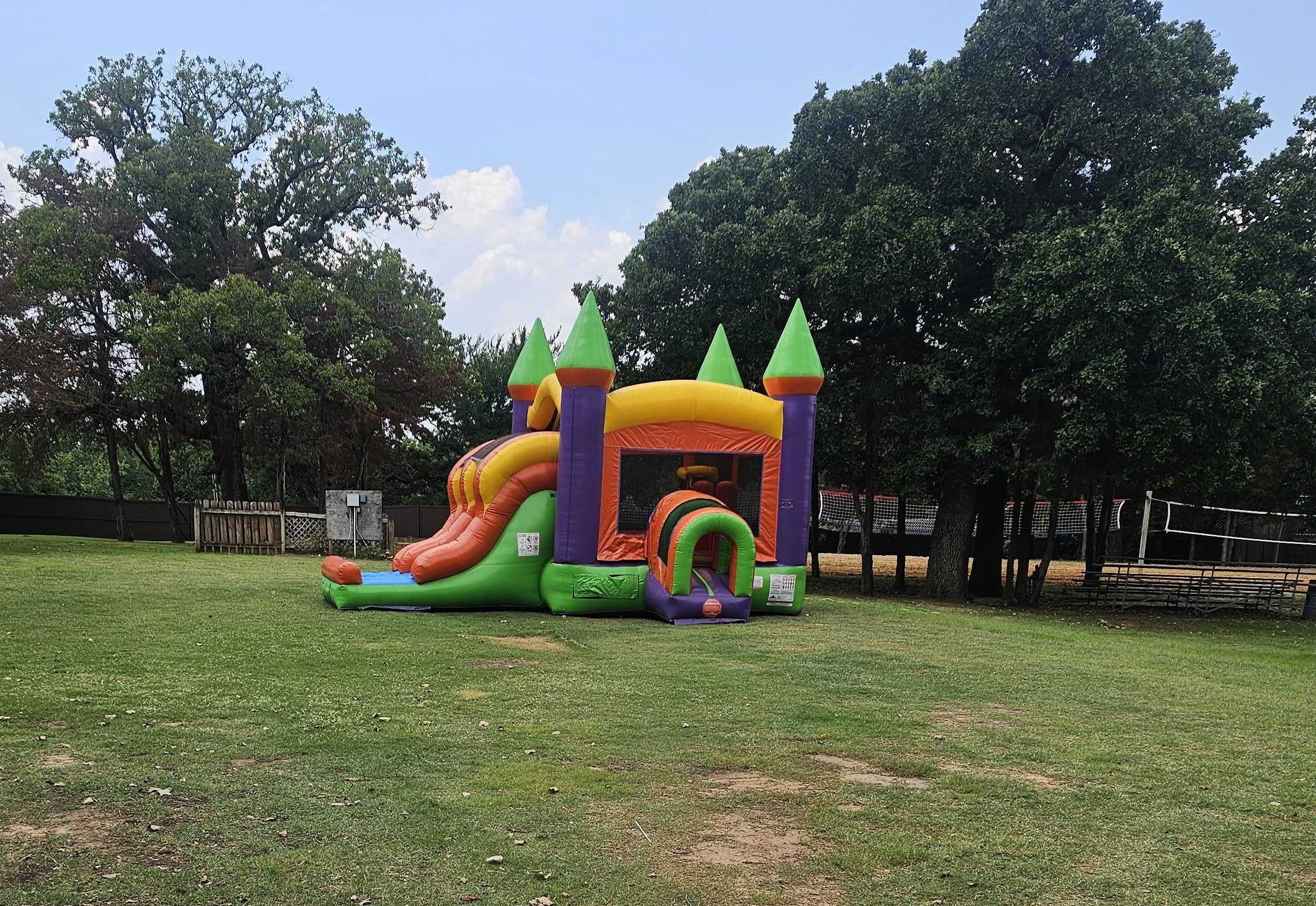 Let the kiddos jump into a world of fun with the Inflatable Castle Combo! Bright, colorful, and designed just for kids of all ages, this exciting inflatable lets kids bounce, laugh, and play inside the castle before climbing the mini rock wall and sliding down two fun slide lanes to the bottom.